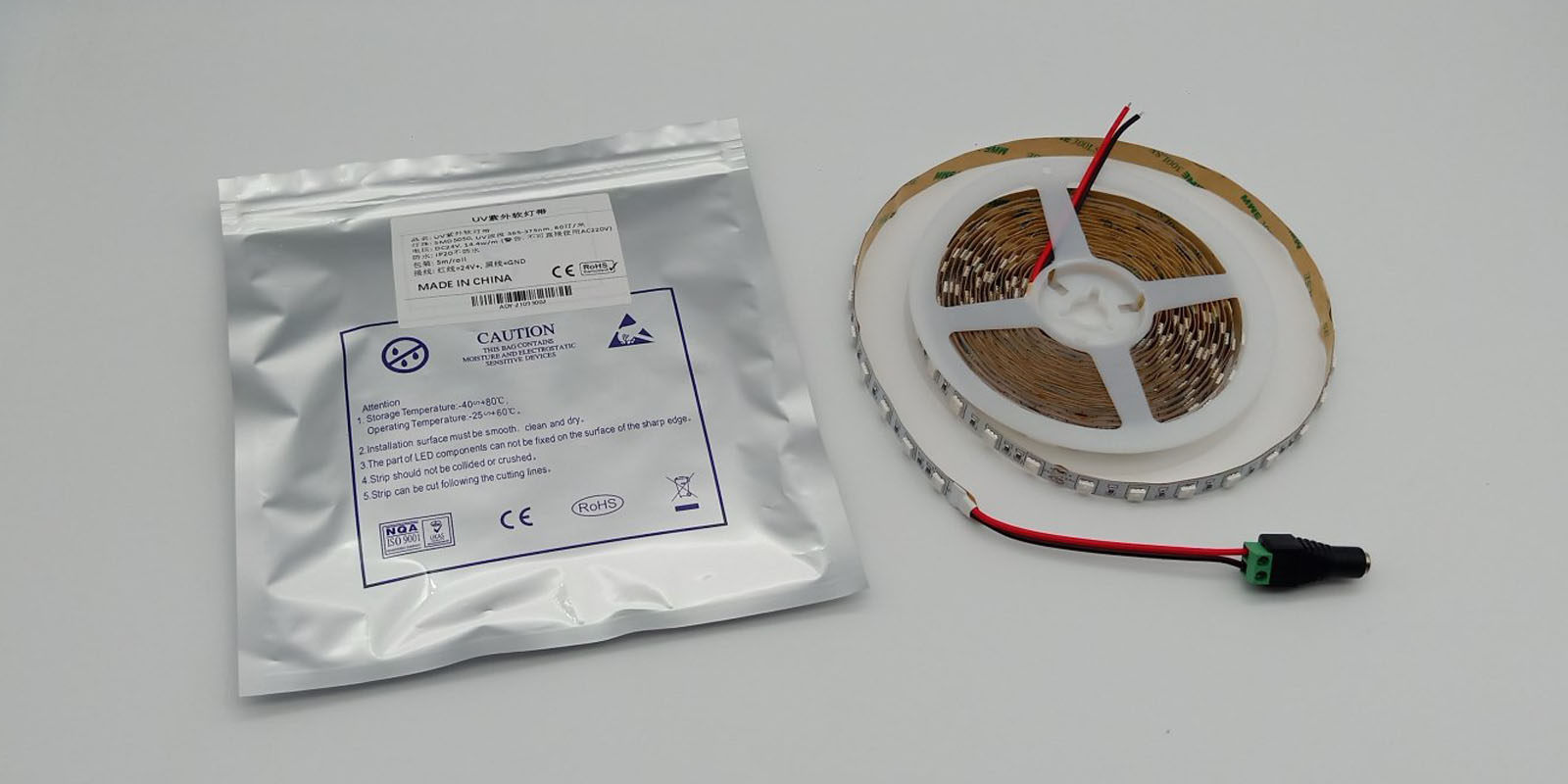 > 两款紫光灯带是很特殊的,亮度不高,发出的是紫外线,因为人眼看不到紫外线,只能看到紫外线一起发光的微弱的可见光。395nm可见光有较多的蓝紫色,365nm的可见光是微弱的白色。