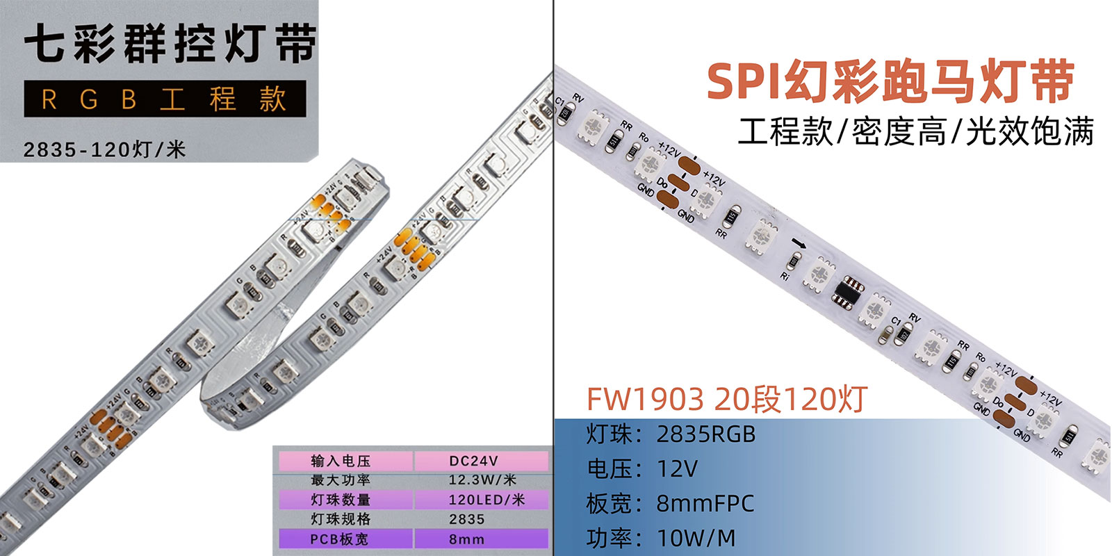 光源规格: SMD 2835 RGB 3色合1灯珠, 120灯/米